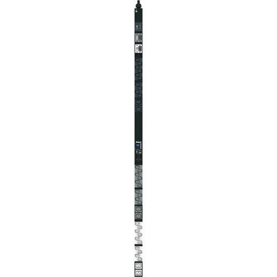 The SmartZone™ G5 Monitored Input PDU features (30) C13 and (6) C19 outlets. It is a 30 amp, 208 V, three phase PDU with a NEMA L15-30P input plug and a 10 foot (3m) power cord. The PDU is black.
