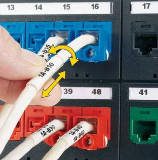 The laser/ink jet, self-laminating Turn-Tell label made of polymer has an innovative design that allows it to rotate to any angle for improved visibility, aesthetics, and easy repositioning on wires and cables. The label has a print-on area 0.38" (9.7 mm) high. It can easily be installed on existing terminated wires and assemblies and does not require disconnecting wires or cables. It is clear with a white print-on area color. The label is 0.50" wide and 1.25" long (12.7 x 31.8 mm). It supports 12-10 AWG wire/cable and Cat 3 UTP cable. It has 8 of labels per row, 60 labels per sheet, and comes in packages of 5000. This Turn-Tell label is available in P1 label Cassettes for the LS8E or LS8EQ printer series and computer printable rolls. It can be used with Easy-Mark Labeling Software and thermal transfer printers.