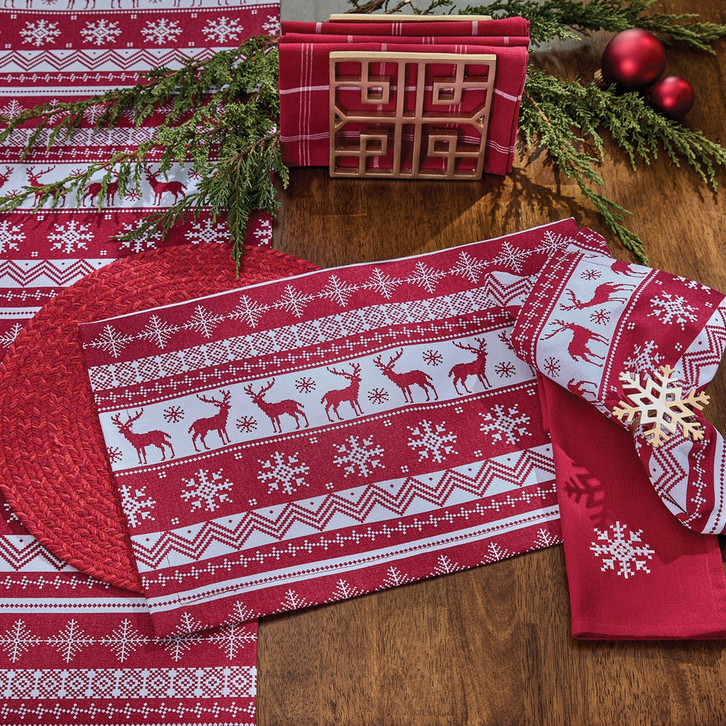 Bring a delightful touch of traditional holiday charm to your table with the "Patricia Heaton Home Holiday Fairisle Placemat." This beautiful placemat, measuring approximately 13 inches by 19 inches, features an eye-catching design inspired by classic Fair Isle patterns, complete with whimsical reindeer and sparkling snowflakes. Its rich red backdrop perfectly embodies the spirit of the season, making it a fantastic addition for festive dinners and holiday parties.