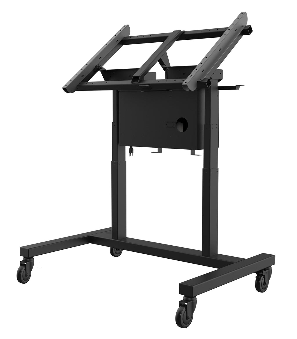 Peerless-AV’s SmartMount Motorized Height Adjustable Tabletop Cart was designed to get the most out of an interactive display. The motorized cart creates an ADA compliant solution by allowing a display to be raised to the appropriate height, based on the specific user, with just a touch of a button. A secondary actuator allows the tilt of the display to be adjusted from vertical to completely horizontal. This allows the interactive display to be used in a standard viewing position, drafting table position, or tabletop position. The rear compartment provides a secure area for a PC and power strip, while the cable management pathway protects the cables from snagging or abrasion when the display is raised or tilted. The cart’s welded base and locking casters provide a stable foundation for touch applications, and the integrated power cord wrap makes moving the solution simple.