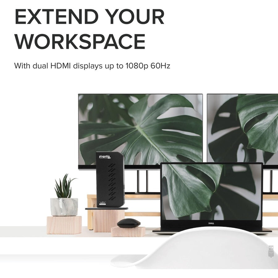 Designed for those who want a one-stop upgrade for your USB 3.0 or USB-C laptop. The Plugable USB 3.0 Dual HDMI Laptop Docking Station for Windows (UD-3900Z) allows you to add dual HDMI monitors, and connect your peripherals, all through a single cable back to your laptop. Quickly come and go from your desk with ease. By connecting one cable to your laptop, you gain 10 extra ports of connectivity, making it easier to do more work in less time.