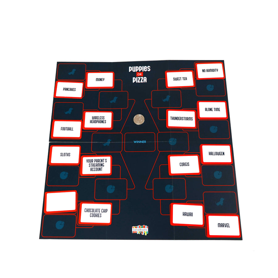 Puppies or Pizza can be played multiple ways, but the easiest is to draw cards, set them up on the board in a tournament-style bracket, and vote on each set until you only have 1 card left.