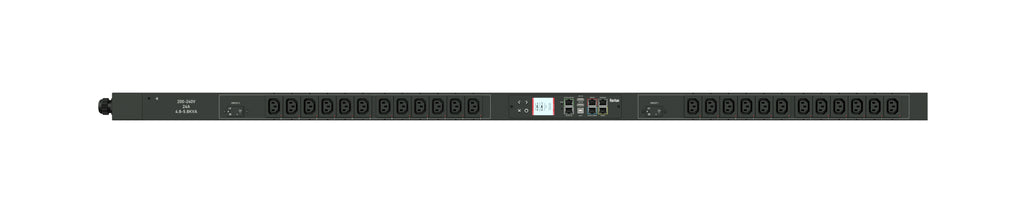 Monitored rack power distribution unit (0U [vertical], 5kVA, 24 outlets). INPUT: 208v, 30a - NEMA L6-30P plug (2P3W); OUTPUT: 24@ C13 outlets; on 2@ 2-pole, 20a Overcurrent Protectors; FEATURES: Billing-Grade (+/- 1%) Energy Metering [kW, kVA, V, A, Power Factor] - per inlet, per breaker/fuse, per outlet; Remote network monitoring via HTML, JSON-RPC, SSH, Telnet, MODBUS/TCP, and SNMPv3. Onboard embedded processor with minimum 536MHz clock speed, 16MB SPI Flash, and 64MB DDR2 RAM. Cascading upto 16 PDU's using single Ethernet or USB connection. Environmental monitoring [temp/humidity] capable – up to 32 sensors. Individual outlet numbers labeled on chassis. Automated deployment via TFTP, DHCP, SSH(CLI), or USB Flash Drives. WiFi Capable. USB Webcam Capable. iPad/iPhone/Android App. Dual 10/100/1000 Ethernet port. Tri-color status LED per receptacle. Breaker metering and alarming (0V detection). Max Dimensions 52mm x 65mm x 1539mm (2.1in x 2.6in x 60.6in). Max Weight TBD. Maximum ambient temperature 60C at full load.