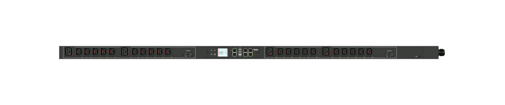 Monitored rack power distribution unit (0U [vertical], 5kVA, 24 outlets). INPUT: 208v, 30a - NEMA L6-30P plug (2P3W); OUTPUT: 20@ C13 Locking, 4@ C19 Locking outlets; on 2@ 2-pole, 20a Overcurrent Protectors; FEATURES: Billing-Grade (+/- 1%) Energy Metering [kW, kVA, V, A, Power Factor] - per inlet, per breaker/fuse, per outlet; Remote network monitoring via HTML, JSON-RPC, SSH, Telnet, MODBUS/TCP, and SNMPv3. Onboard embedded processor with minimum 536MHz clock speed, 16MB SPI Flash, and 64MB DDR2 RAM. Cascading upto 16 PDU's using single Ethernet or USB connection. Environmental monitoring [temp/humidity] capable – up to 32 sensors. Individual outlet numbers labeled on chassis. Automated deployment via TFTP, DHCP, SSH(CLI), or USB Flash Drives. WiFi Capable. USB Webcam Capable. iPad/iPhone/Android App. Dual 10/100/1000 Ethernet port. Tri-color status LED per receptacle. Breaker metering and alarming (0V detection). Max Dimensions 52mm x 71mm x 1539mm (2.1in x 2.8in x 60.6in). Max Weight 5.9 kg. Maximum ambient temperature 60C at full load.