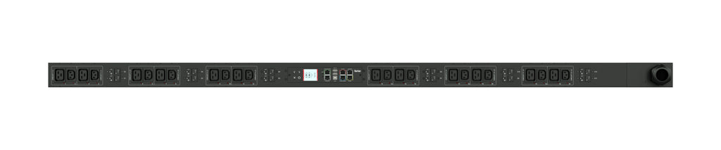 Monitored and switched rack power distribution unit (0U [vertical], 43.6kVA, 24 outlets). INPUT: 400v (3-phase WYE), 63a - IEC 60309 3P+N+E 6h 63A plug (4P5W); OUTPUT: 12@ C13, 12@ C19 outlets; on 12@ 1-pole, 16a Overcurrent Protectors; FEATURES: Billing-Grade (+/- 1%) Energy Metering [kW, kVA, V, A, Power Factor] - per inlet, per breaker/fuse, per outlet; Remote network monitoring via HTML, JSON-RPC, SSH, Telnet, MODBUS/TCP, and SNMPv3. Onboard embedded processor with minimum 536MHz clock speed, 16MB SPI Flash, and 64MB DDR2 RAM. Cascading upto 16 PDU's using single Ethernet or USB connection. Environmental monitoring [temp/humidity] capable – up to 32 sensors. Individual outlet numbers labeled on chassis. Automated deployment via TFTP, DHCP, SSH(CLI), or USB Flash Drives. WiFi Capable. USB Webcam Capable. iPad/iPhone/Android App. Dual 10/100/1000 Ethernet port. Tri-color status LED per receptacle. Breaker metering and alarming (0V detection). Max Dimensions 70mm x 80mm x 1780mm (2.8in x 3.1in x 70.1in). Max Weight 13 kg. Maximum ambient temperature 60C at full load.