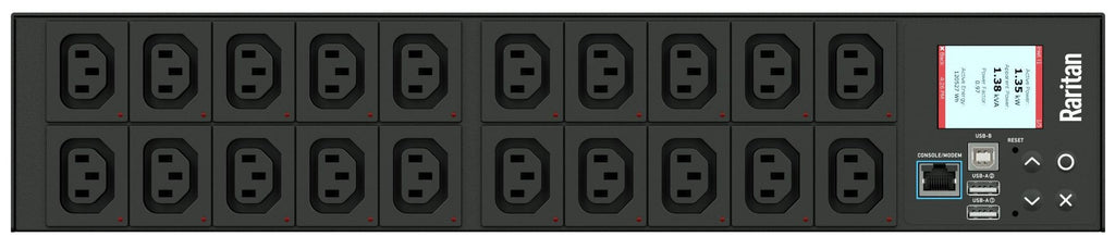 Raritan PX3-5434R. PDU types: Metered, Monitored, Switched, Rack capacity: 2U, Mounting: Horizontal. AC outlets quantity: 20 AC outlet(s), AC outlet types: C13 coupler, Input connection type: NEMA L6-20P (2P3W). Cable length: 3 m, Metering: Voltage, Current, Active Power, Real Power, Energy, Power Facrot, Certification: UL, ICES-003, FCC. Nominal input voltage: 200-240 V, Maximum current: 20 A, AC input frequency: 50 - 60 Hz. Dimensions (WxDxH): 440 x 293 x 88 mm, Weight: 6.2 kg