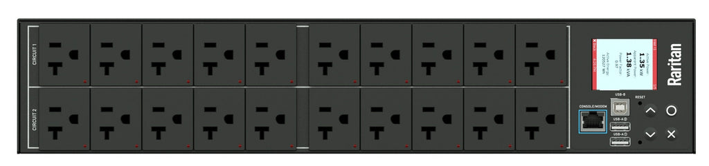 Raritan PX3-5453R. PDU types: Metered, Monitored, Switched, Rack capacity: 2U, Mounting: Horizontal. AC outlets quantity: 20 AC outlet(s), AC outlet types: NEMA 5–20R, Input connection type: NEMA L5-30P (2P3W). Cable length: 3 m, Metering: Voltage, Current, Active Power, Real Power, Energy, Power Facrot. Nominal input voltage: 120 V, Maximum current: 30 A, AC input frequency: 50 - 60 Hz. Dimensions (WxDxH): 440 x 292 x 88 mm, Weight: 6.8 kg