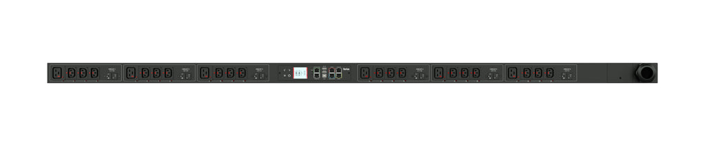Monitored and switched rack power distribution unit (0U [vertical], 17.3kVA, 24 outlets). INPUT: 208v (3-phase DELTA), 60a - IEC 60309 3P+E 9h 60A plug (3P4W); OUTPUT: 18@ C13 Locking, 6@ C19 Locking outlets; on 6@ 2-pole, 20a Overcurrent Protectors; FEATURES: Billing-Grade (+/- 1%) Energy Metering [kW, kVA, V, A, Power Factor] - per inlet, per breaker/fuse, per outlet; Remote Outlet Switching (Bi-State Latching Relays); Color, matrix LCD display : Voltage, current, or active power (per line, per breaker, or per receptacle / outlet); Alarms; Configuration information (name, ratings, IP / Networking information). Auto-flip orientation; Field-Replaceable, hot-swappable network module with 400MHz processor, 16MB NOR Flash, and 64MB SDRAM; (10/100) Ethernet portRemote network monitoring via HTML, JSON-RPC, SSH, Telnet, MODBUS/TCP, and SNMPv3. Environmental monitoring [temp/humidity] capable ñ up to 32 sensors. Individual outlet numbers labeled on chassis. Automated deployment via TFTP, DHCP/PXE, SSH(CLI), or USB Flash Drives. WiFi Capable. USB Webcam Capable. iPad/iPhone/Android App. Tri-color status LED per receptacle. Breaker metering and alarming (0V detection). Max Dimensions 59mm x 80mm x 1780mm (2.3in x 3.1in x 70.1in). Max Weight 12.9 kg. Maximum ambient temperature 60C at full load.