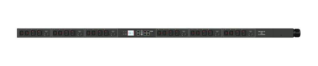 Monitored and switched rack power distribution unit (0U [vertical], 17.3kVA, 24 outlets). INPUT: 208v (3-phase DELTA), 60a - IEC 60309 3P+E 9h 60A plug (3P4W); OUTPUT: 12@ C13 Locking, 12@ C19 Locking outlets; on 6@ 2-pole, 20a Overcurrent Protectors; FEATURES: Billing-Grade (+/- 1%) Energy Metering [kW, kVA, V, A, Power Factor] - per inlet, per breaker/fuse, per outlet; Remote network monitoring via HTML, JSON-RPC, SSH, Telnet, MODBUS/TCP, and SNMPv3. Onboard embedded processor with minimum 536MHz clock speed, 16MB SPI Flash, and 64MB DDR2 RAM. Cascading upto 16 PDU's using single Ethernet or USB connection. Environmental monitoring [temp/humidity] capable – up to 32 sensors. Individual outlet numbers labeled on chassis. Automated deployment via TFTP, DHCP, SSH(CLI), or USB Flash Drives. WiFi Capable. USB Webcam Capable. iPad/iPhone/Android App. Dual 10/100/1000 Ethernet port. Tri-color status LED per receptacle. Breaker metering and alarming (0V detection). Max Dimensions 59mm x 80mm x 1780mm (2.3in x 3.2in x 70.1in). Max Weight TBD. Maximum ambient temperature 60C at full load.