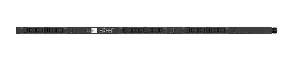 Monitored and switched rack power distribution unit (0U [vertical], 22.2kVA, 30 outlets). INPUT: 400v (3-phase WYE), 32a - IEC 60309 3P+N+E 6h 32A plug (4P5W); OUTPUT: 24@ C13, 6@ C19 outlets; on 6@ 1-pole, 16a Overcurrent Protectors; FEATURES: Billing-Grade (+/- 1%) Energy Metering [kW, kVA, V, A, Power Factor] - per inlet, per breaker/fuse, per outlet; Remote network monitoring via HTML, JSON-RPC, SSH, Telnet, MODBUS/TCP, and SNMPv3. Onboard embedded processor with minimum 536MHz clock speed, 16MB SPI Flash, and 64MB DDR2 RAM. Cascading upto 16 PDU's using single Ethernet or USB connection. Environmental monitoring [temp/humidity] capable – up to 32 sensors. Individual outlet numbers labeled on chassis. Automated deployment via TFTP, DHCP, SSH(CLI), or USB Flash Drives. WiFi Capable. USB Webcam Capable. iPad/iPhone/Android App. Dual 10/100/1000 Ethernet port. Tri-color status LED per receptacle. Breaker metering and alarming (0V detection). Max Dimensions 52mm x 65mm x 1780mm (2.1in x 2.6in x 70.1in). Max Weight TBD. Maximum ambient temperature 60C at full load.