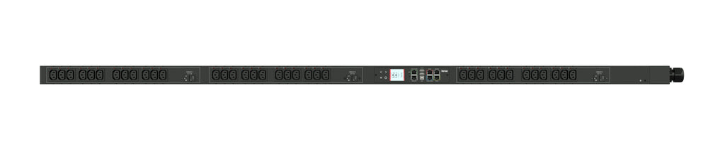 Monitored and switched rack power distribution unit (0U [vertical], 8.6kVA, 36 outlets). INPUT: 208v (3-phase DELTA), 30a - NEMA L15-30P plug (3P4W); OUTPUT: 36@ C13 outlets; on 3@ 2-pole, 20a Overcurrent Protectors; FEATURES: Billing-Grade (+/- 1%) Energy Metering [kW, kVA, V, A, Power Factor] - per inlet, per breaker/fuse, per outlet; Remote network monitoring via HTML, JSON-RPC, SSH, Telnet, MODBUS/TCP, and SNMPv3. Onboard embedded processor with minimum 536MHz clock speed, 16MB SPI Flash, and 64MB DDR2 RAM. Cascading upto 16 PDU's using single Ethernet or USB connection. Environmental monitoring [temp/humidity] capable – up to 32 sensors. Individual outlet numbers labeled on chassis. Automated deployment via TFTP, DHCP, SSH(CLI), or USB Flash Drives. WiFi Capable. USB Webcam Capable. iPad/iPhone/Android App. Dual 10/100/1000 Ethernet port. Tri-color status LED per receptacle. Breaker metering and alarming (0V detection). Max Dimensions 52mm x 65mm x 1780mm (2.1in x 2.6in x 70.1in). Max Weight 7.1 kg. Maximum ambient temperature 60C at full load.