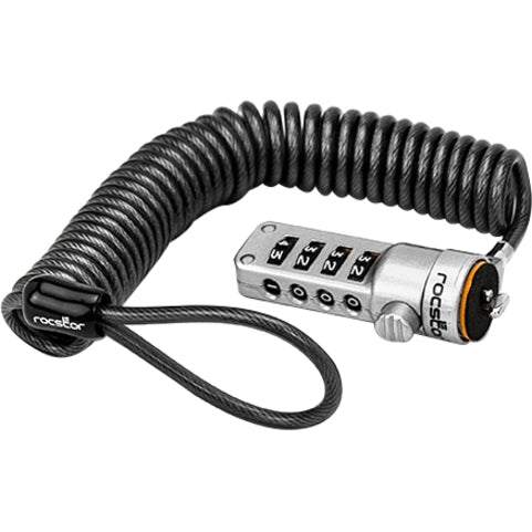 Rocstor Rocbolt Portable Security Cable With Combination Lock and Self-Coiling Steel Cable - Resettable - 4-digit - Galvanized Steel, Zinc Alloy - 6 ft - For Notebook, Docking Station, Desktop Computer, Monitor (Compatible to Kensington® K64670AM) PORTABLE LOCK SECURITY CABLE 4 DIGIT LOCK