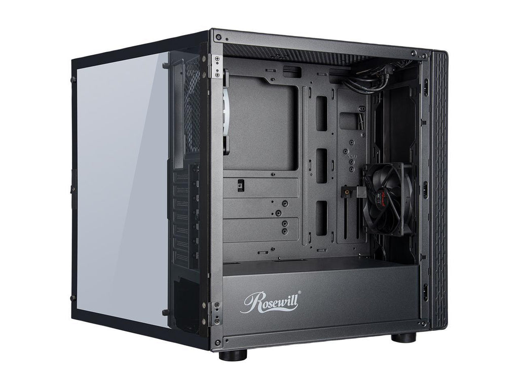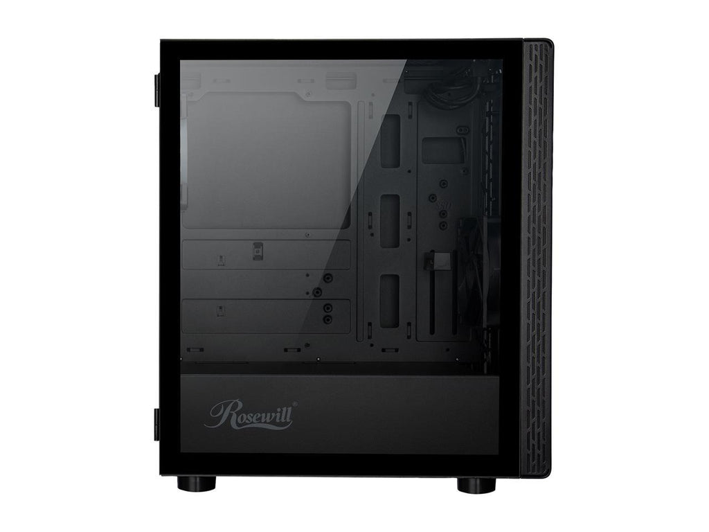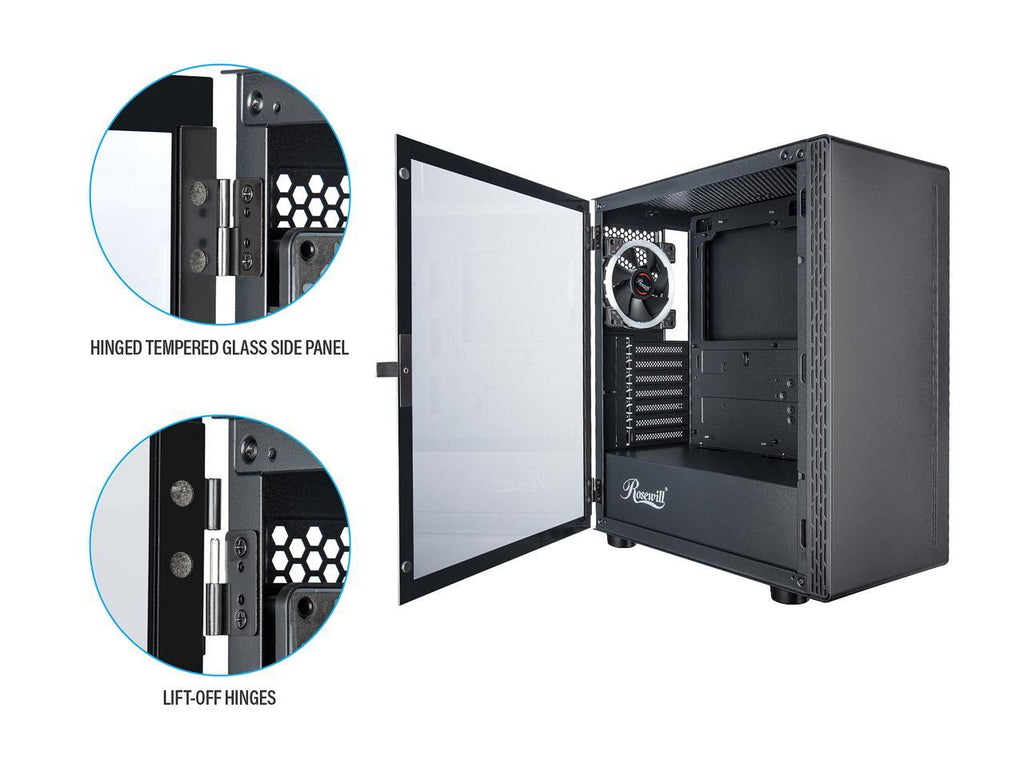 Tempered glass side panel is full sized and lightly tinted to show off components, case mods and more. Easily access the internal chamber via the pull-to-open panel tab and lift-off hinges, without needing thumb screws.