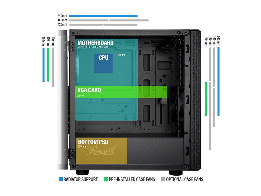 Optimize cooling with optional installation of 240mm radiator in front or on top, plus 120mm in the rear. Maintain system performance and minimize particle buildup with the protective dust filters on top and bottom.