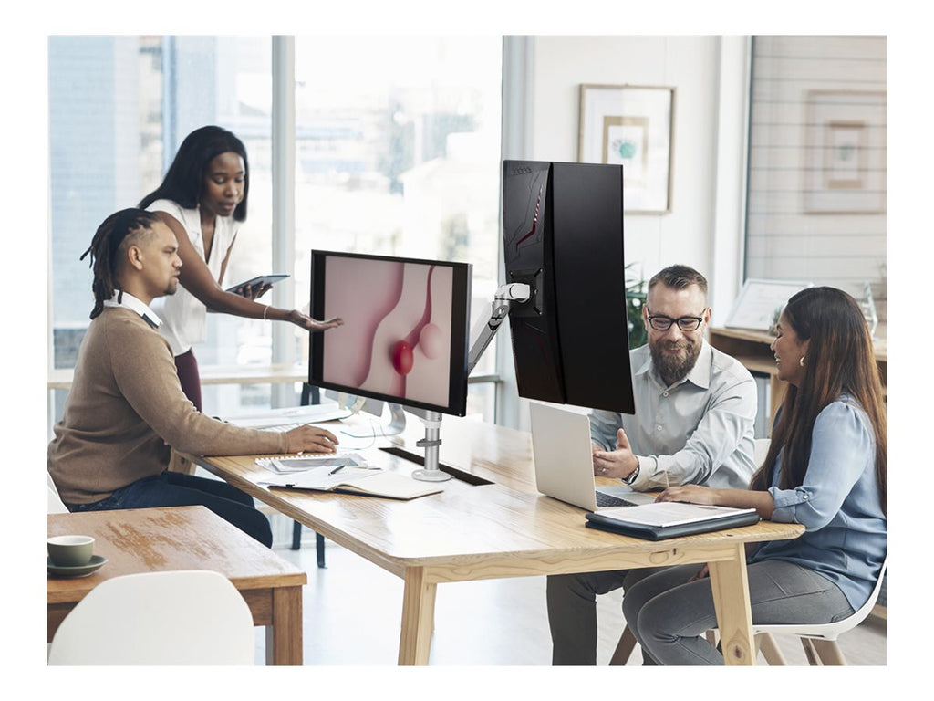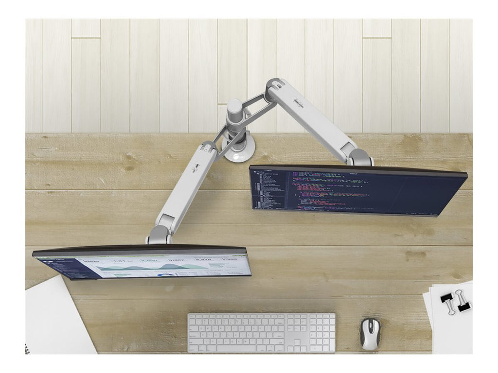 SIIG MTPRO Desk Mount Dual Monitor Arm - Mounting kit (desk mount, 2 articulating arms) - mechanical spring - for 2 monitors - up to 32 Dual Monitor Arm Desk Mount - Up to 32" monitor, Max Load up to 19.8 lbs(Each), Visible Screen Weight Indicator, Full Motion Height Swivel Tilt Rotation Adjustable, VESA 75/100mm, Detachable VESA Plate, Cable Management, Tools Storage, Compliant with BIFMA X5.5 24 standard testing and compliant with TAA; This monitor arm that offers a wide range of height adjustment options, Lift the arm up to 19.65 inches (499 mm), Extend up to 18.15 inches from the wall; Fine-tune your monitor setup with 90° upward tilt, 40° downward tilt, 360°swivel and screen rotation 360° for landscape or portrait mode, easy to hold the screen in the correct, comfortable position to meet your needs; Built-in the visible screen weight indicator and manually controlled spring tension in the upper arm allow for easy adjustment, C-clamp Mount Method fits most desktops from 0.71" to 2.24" (18mm to 57mm) thick with a needed (50mm) depth, Detachable VESA Plate, Hidden tool storage design;
