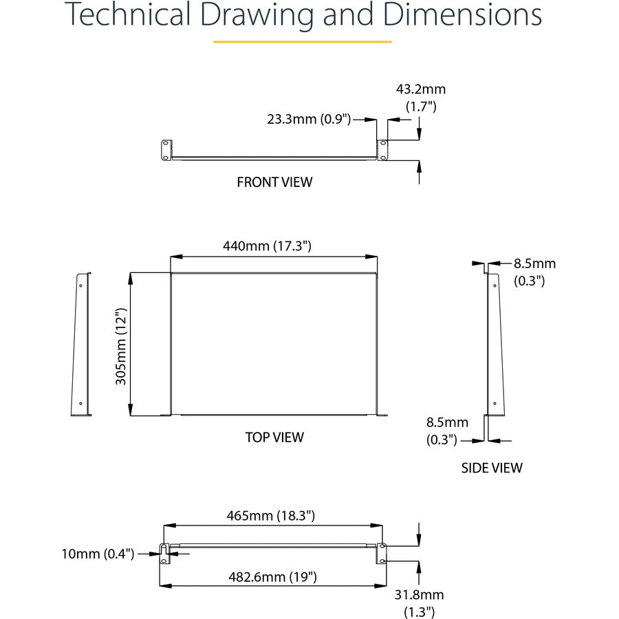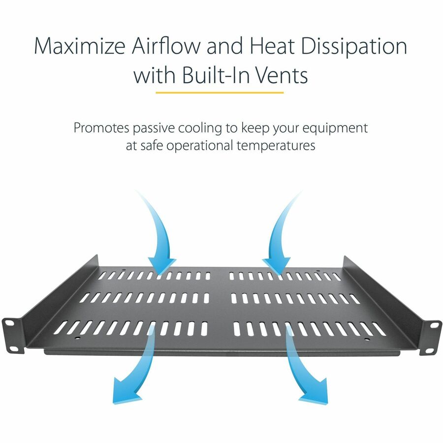 Add a sturdy, fixed shelf into almost any server rack or cabinetThe SHELF-1U-12-FIXED-S lets you add a 1U 12 inches (30.5 cm) deep shelf to any EIA-310 compliant 19-inch rack or cabinet.Quality constructionThe fixed-rack shelf can hold up to 55 lbs (25 kg) of equipment and is constructed using 2.0 mm SPCC commercial-grade cold-rolled steel for long-term durability and sturdiness. Accommodate your accessories or non-mountable devices for ease of access or connectivity to your equipment.Two installation optionsYou can install the 1U rack shelf using one of two different orientations for mounting. The standard, with the lip facing downwards or inversed with the lip facing upwards that prevents your equipment from sliding off.Hardware includedConveniently includes M6 square cage nuts and M6 screws to setup your equipment in no time.The SHELF-1U-12-FIXED-S is backed by a StarTech.com lifetime warranty and free lifetime technical support.The StarTech.com Advantage