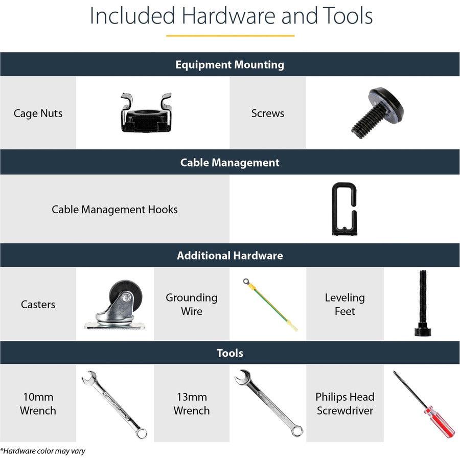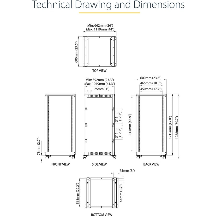 Computer Equipment Rack | 23" to 41" Adjustable Mounting Depth | Casters | Leveling Feet | Cable Management HooksThe 4POSTRACK25U 25U Server Rack lets you store your servers, network and telecommunications equipment in a sturdy, adjustable depth open-frame rack.Designed with ease of use in mind, this 25U rack offers easy-to-read markings for both rack units (U) and depth, with a wide range of mounting depth adjustments (22 - 40in) that make it easy to adapt the rack to fit your equipment.This durable 4-post rack supports a static loading capacity of up to 1200lbs (544kg), and offers compliance with several industry rack standards (EIA/ECA-310, IEC 60297, DIN 41494) for a universal design that's compatible with most rack equipment.For a complete server storage solution that saves you time and hassle, the rack includes optional accessories such as casters, leveling feet and cable management hooks. The base is also pre-drilled for securely fastening the rack to the floor if needed, providing you with additional stability to better suit your server environment.Backed by a StarTech.com 2-year warranty and free lifetime technical support.