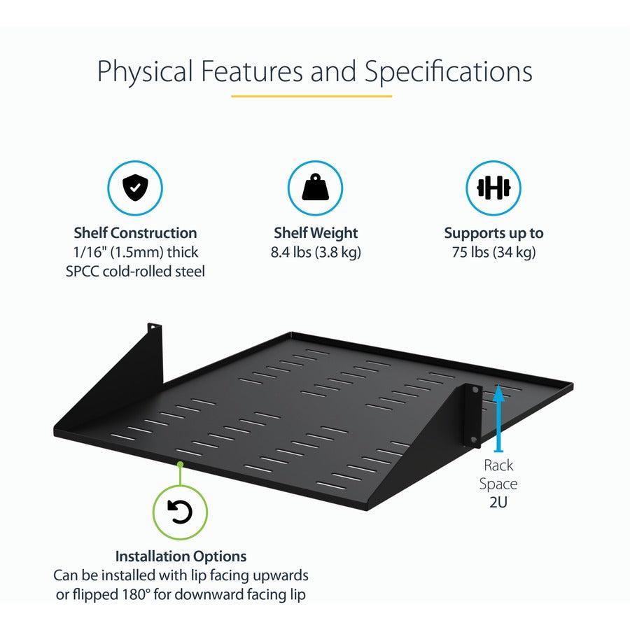 StarTech.com 2-Post Server Rack Shelf - Center Mount - 19 Inch -2U - Black - Supports up to 75 lb. (34 kg) - Vented (CABSHF2POSTV2)