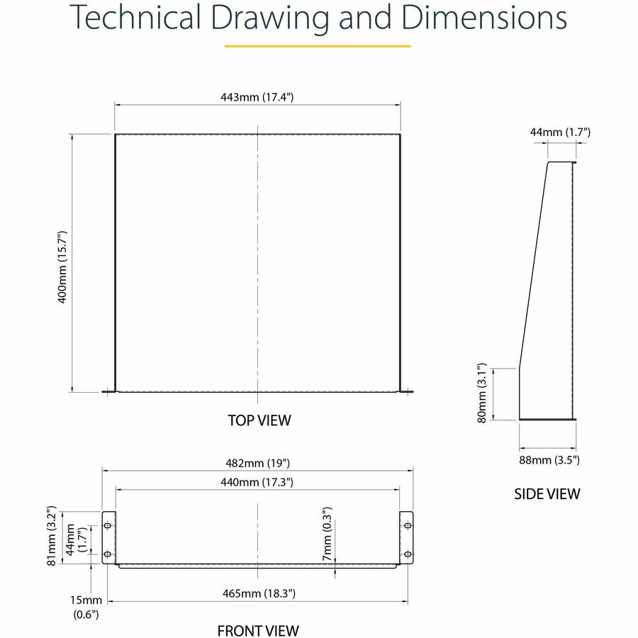 Add a sturdy, fixed shelf into almost any server rack or cabinetThe Black CABSHELF Standard Universal Server Rack Cabinet Shelf helps to efficiently organize your mission critical computer hardware and accessories by adding a fixed shelf with the capacity to hold up to 20 kg (44 lbs). This TAA compliant product adheres to the requirements of the US Federal Trade Agreements Act (TAA), allowing government GSA Schedule purchases.Universally mountable in any standard front mount 19” server rack or cabinet, the rack shelf is constructed of sturdy, cold-rolled steel for long-term durability.Backed by a StarTech.com Lifetime warranty.The StarTech.com Advantage