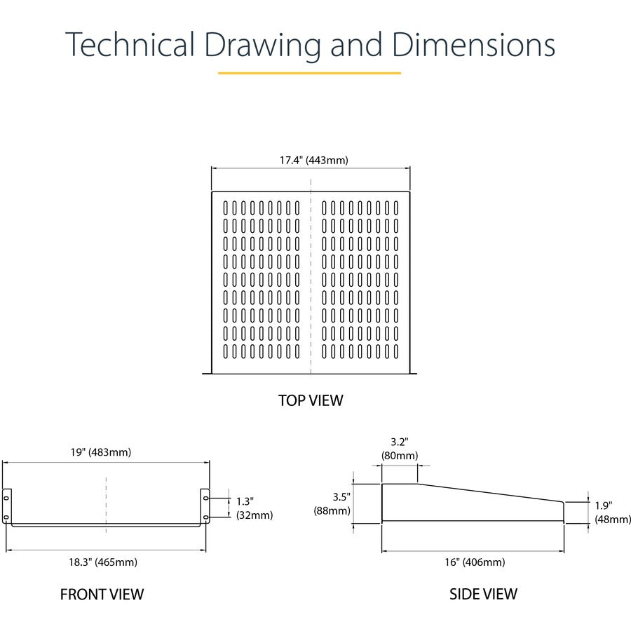 Add a sturdy, 22in depth vented shelf into almost any server rack or cabinetThe CABSHELF22V 2U 22in Depth Vented Rack Mount Shelf lets you add a compact, 2U shelf to virtually any standard 19-inch server rack or cabinet with front mount options. This TAA compliant product adheres to the requirements of the US Federal Trade Agreements Act (TAA), allowing government GSA Schedule purchases.Our vented rack shelves improve air flow and help to lower temperatures in the rack. Constructed using SPCC commercial grade cold-rolled steel, this durable fixed rack shelf can hold up to 22kg (50lbs) of equipment - a perfect solution for storing small, non-rackmount equipment, tools, peripherals or accessories in your rack to keep them readily accessible.Backed by a StarTech.com Lifetime warranty.The StarTech.com Advantage