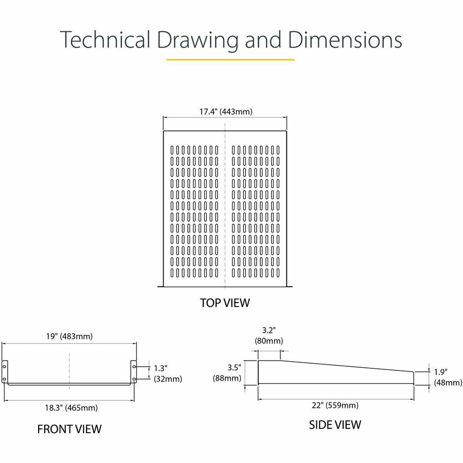 Add a sturdy, 22in depth vented shelf into almost any server rack or cabinetThe CABSHELF22V 2U 22in Depth Vented Rack Mount Shelf lets you add a compact, 2U shelf to virtually any standard 19-inch server rack or cabinet with front mount options. This TAA compliant product adheres to the requirements of the US Federal Trade Agreements Act (TAA), allowing government GSA Schedule purchases.Our vented rack shelves improve air flow and help to lower temperatures in the rack. Constructed using SPCC commercial grade cold-rolled steel, this durable fixed rack shelf can hold up to 22kg (50lbs) of equipment - a perfect solution for storing small, non-rackmount equipment, tools, peripherals or accessories in your rack to keep them readily accessible.Backed by a StarTech.com Lifetime warranty.The StarTech.com Advantage