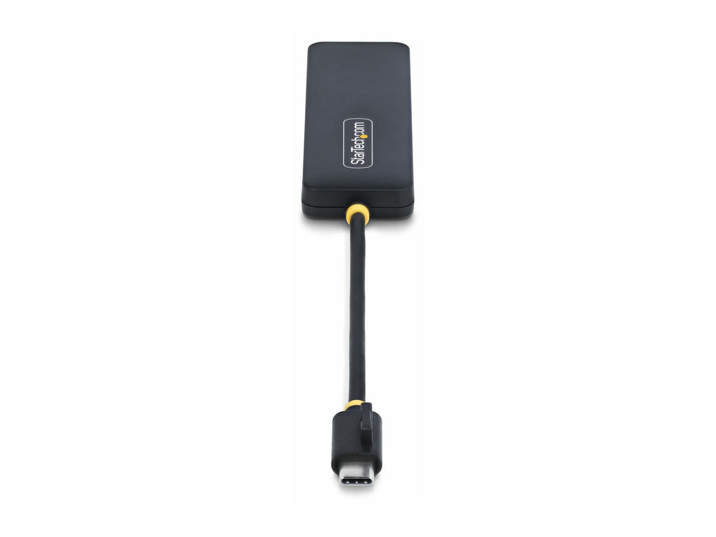 Connect up to four USB 3.0 devices to a laptop/PC via a single available USB Type-C port. With its compact, lightweight, and USB-powered design, this 4-port USB hub is perfect for mobility and travel. It easily fits into a laptop bag, allowing you to expand your connection options almost anywhere you need to. The hub also features small-footprint housing, which means it takes up less desk space. It's perfect for connecting common USB devices such as a mouse, keyboard, or flash drive. This versatile hub features a built-in 5in (13cm) USB cable and is bus-powered, so it draws its power directly from the computer's USB port, reducing clutter and simplifying setup by eliminating the need for an external power adapter. With three ports on one side and one on the end, this hub provides easy access for connecting and disconnecting devices. The USB Hub is OS independent, supporting all operating systems (Windows, macOS, ChromeOS, and Linux), and installs automatically when connected to a computer. Additionally, this hub is compatible with all hardware platforms, including Intel, AMD and Apple Silicon.