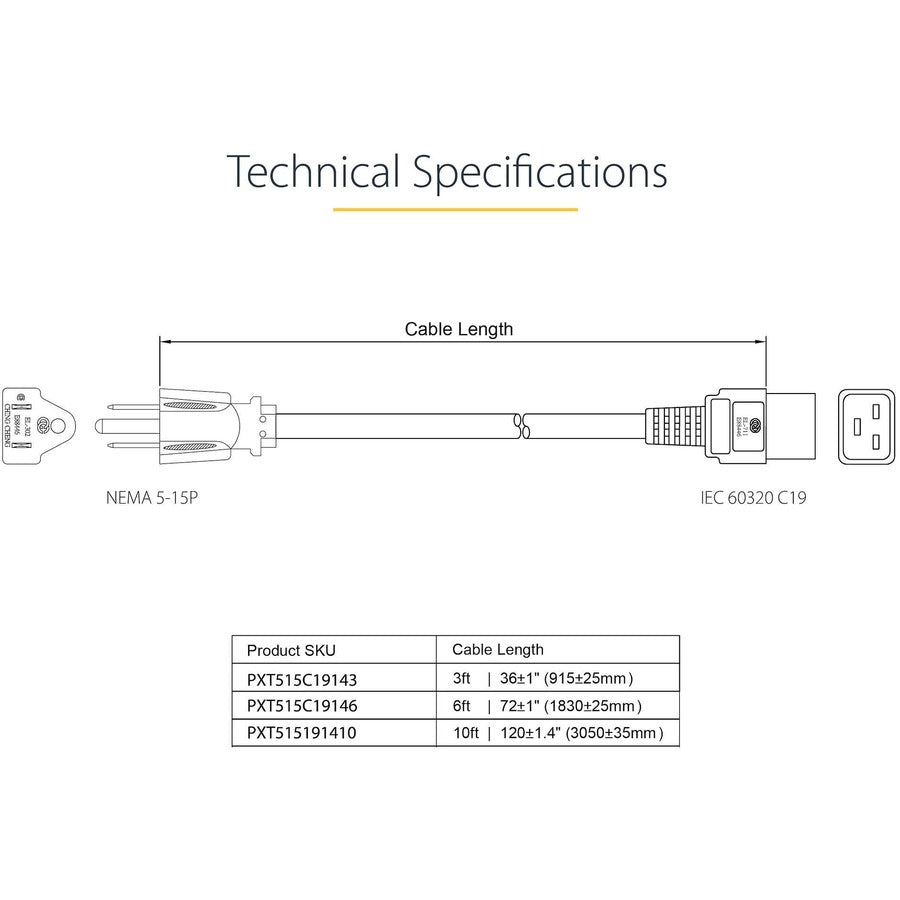 StarTech.com Computer power cord - NEMA 5-15P to C19, 14 AWG, 6 ft. Cable length: 1.8 m, Connector 1: NEMA 5-15P, Connector 2: C19 coupler, Cable type: SJT. Input voltage: 125 V, Input current: 15 A