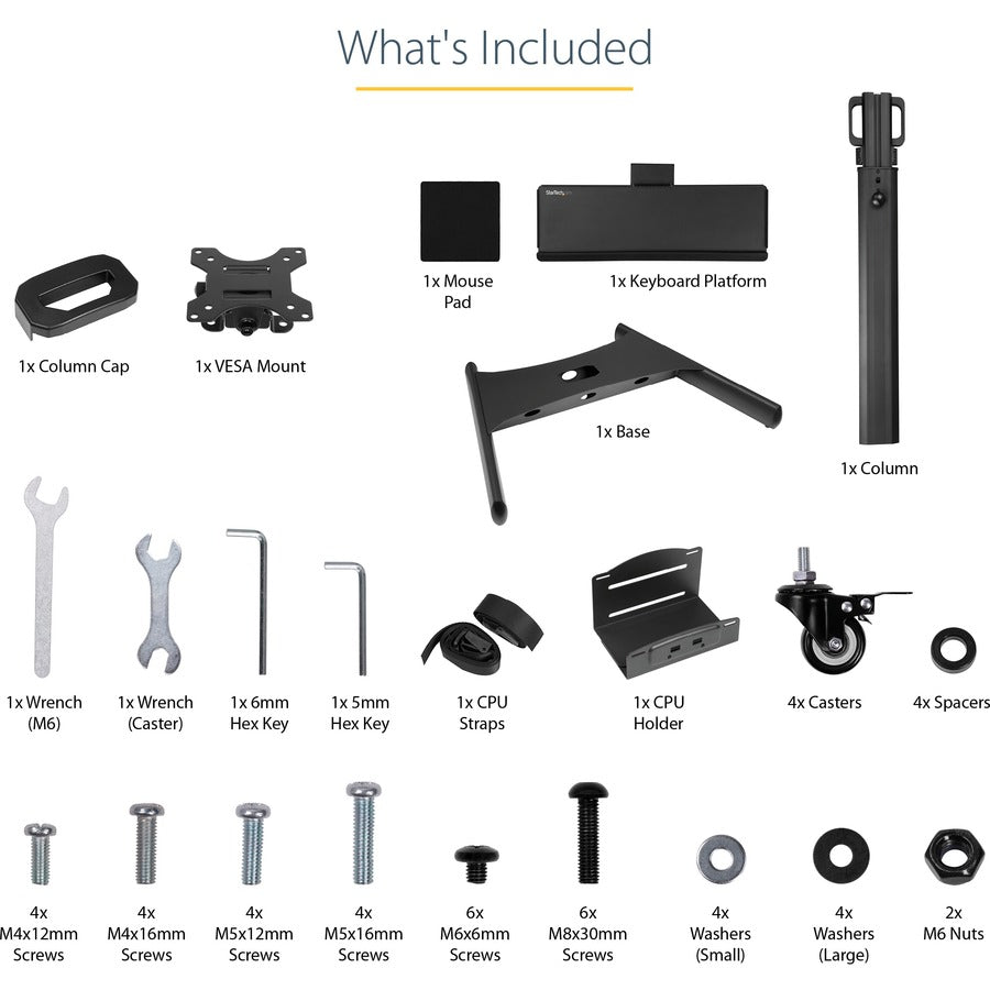 StarTech.com Mobile Workstation Cart with Monitor Mount, CPU/PC Holder, Keyboard Tray - Ergonomic Height Adjustable Desktop Computer Cart - Rolling Mobile Standing Workstation on Wheels. Product colour: Black, Angle of rotation: 360°, Tilt angle range: -30 - 30°. Working surface area: 650 - 243. Package width: 1100 mm, Package depth: 725 mm, Package height: 177 mm. Wrench type: Hexagonal wrench. Master (outer) case length: 725 mm, Products per master (outer) case: 1 pc(s), Master (outer) case height: 177 mm