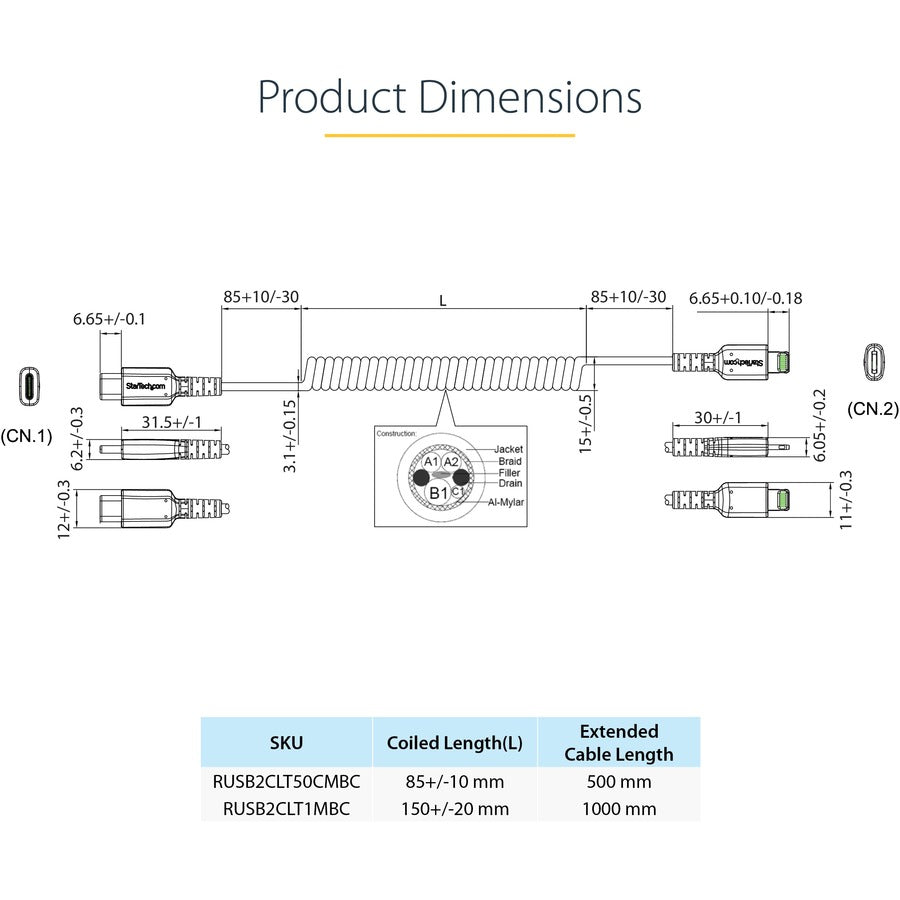 USB C to Lightning Cable 50cm/20in, MFi Certified CableThis coiled Lightning to USB C cable can withstand the daily demands of charging and syncing your mobile devices. It contracts to 1ft (30cm) making it compact and convenient to store.Built for Daily UseThe durable Lightning charging cable has aramid fiber reinforcement that shelters it from the stress of frequent bends. This also lets the cable flex without over-stretching or damaging the core of the cable.Flexible Strain ReliefThe Lightning to USB-C cable is constructed to prevent the connector from separating from the jacket. The extra-long strain relief molding is tested to withstand over 5,000+ bend cycles at a 180° angle.Superior ConnectionThe durable cable supports all USB 2.0 specifications providing a dependable connection for all your Lightning devices. It is also Apple MFi certified which is guaranteed for fast and reliable charge and sync from USB-C charging ports.RUSB2CLT50CMBC is backed by a StarTech.com® 2-year warranty and free lifetime technical support.The StarTech.com Advantage