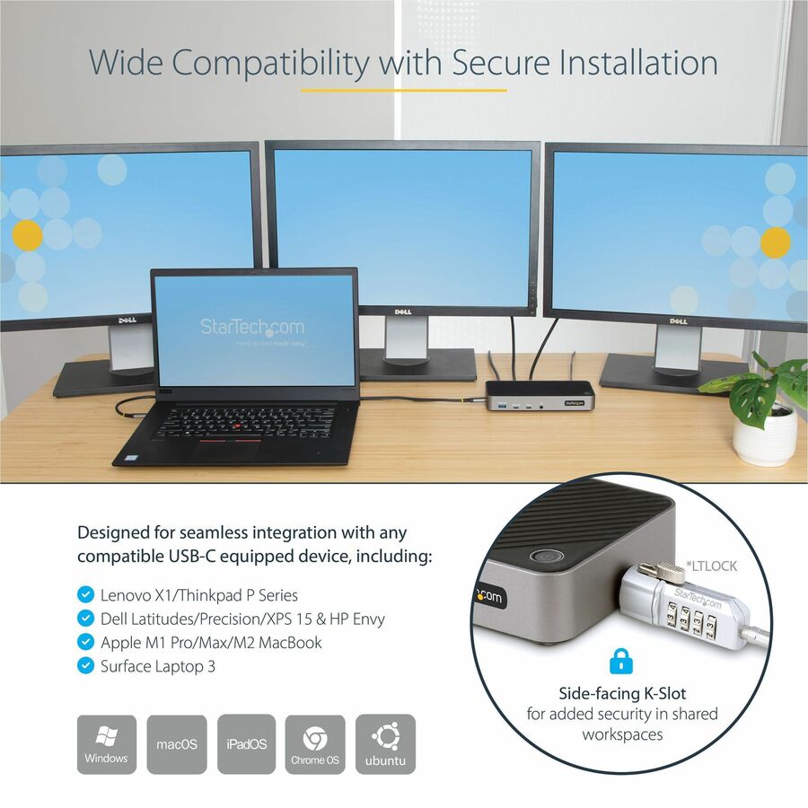 Connect the dock to your host computer, using the included 3.3ft (1m) USB-C cable. The docking station supports all major operating systems, including Windows, macOS, iPad OS, ChromeOS, and Ubuntu. This dock was designed for seamless integration with any compatible USB-C equipped device within your organization, including Lenovo X1/Thinkpad P Series, Dell Latitudes/Precision/XPS 15, HP Envy, Surface Laptop 3, and M1 Pro/Max MacBooks. The dock features a side-facing K-Slot for added security in shared workspaces (e.g., BYOD hoteling/hot-desking).