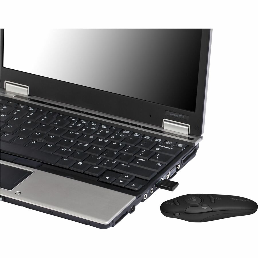 The Targus Wireless Presenter with Laser Pointer makes it easy to control your presentation from up to 30ft away. The ergonomic design with soft touch surface makes it easy to hold the device in your hand and navigate through the buttons comfortably. The built-in laser pointer allows you to highlight key points while the other keys allow you to page up, page down, switch applications, darken screen and resume the presentation. The preset RF connection enables true plug-and-play capability; no driver is required.