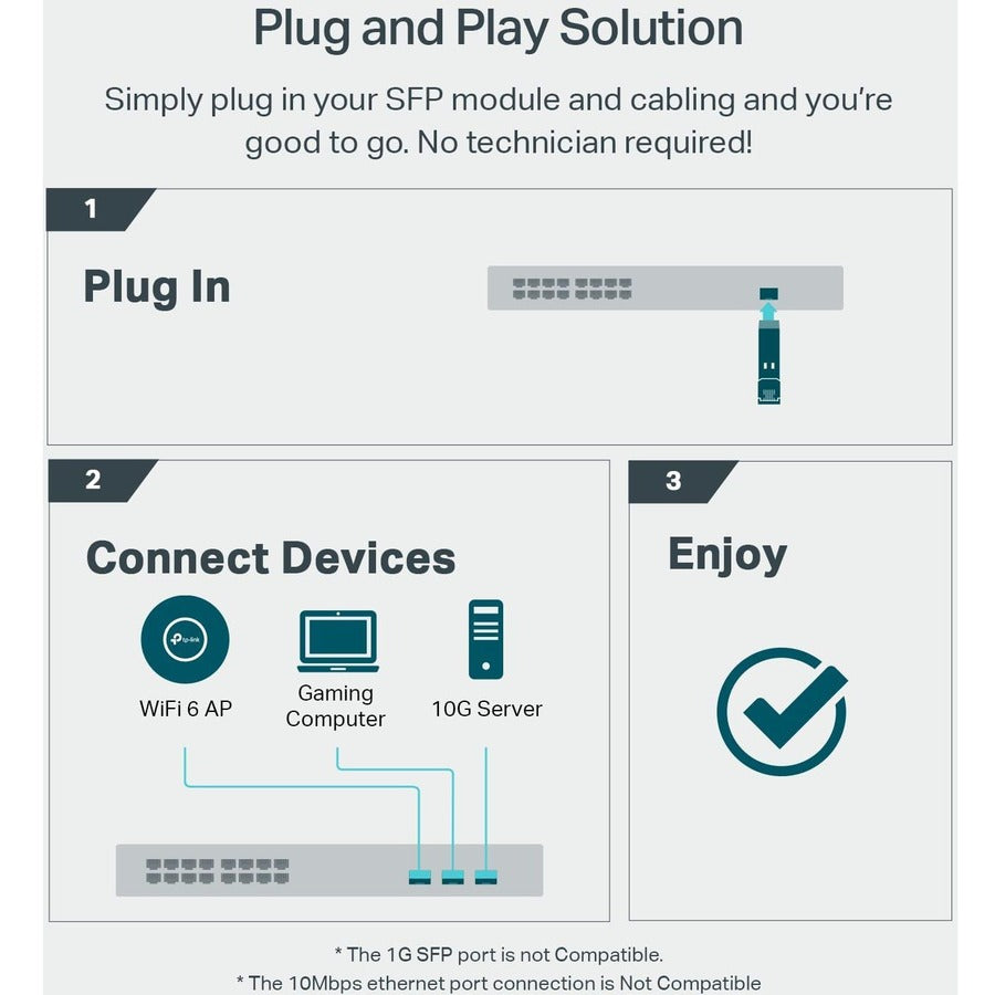 - Wide Compatibility: Compatible with most fiber switches, media converters, routers or other fiber optic equipments with 10G SFP+ ports, TL-SM5310-T provides additional copper cable connections for peace of mind.
