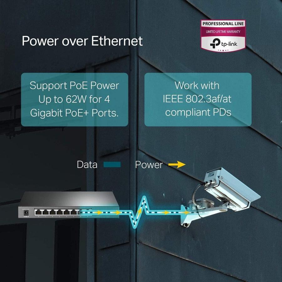 - Flexible Full Gigabit 8-Port Port Configuration: 4 PoE+ (802.3at/af) 10/100/1000 Mbps RJ45 ports providing up to 30W per port and total PoE power budget of 62W, together w/ 4x Gigabit Non-PoE Ports for high-speed connections.