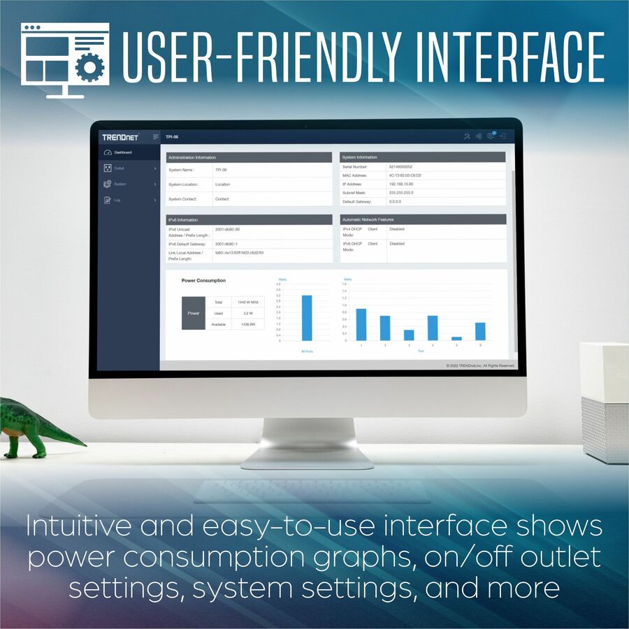 DEVICE INTERFACE: 6 x NEMA 5-15R Managed Power Outlets (15A max. @ 120V AC); 1 x NEMA 5-15R-Bypass Power Outlet (15A max. @ 120V AC); 1 x Gigabit port; LED indicators; 1U 19 Rack mountable MANAGED POWER DISTRIBUTION UNIT: Supports individual controllable power outlets and ability to assign a power schedule to automate the process. MANAGE OUTLET CONTROL: Each managed power outlet can be individually controlled. Utilize port power on/off delay for custom applications. MONITOR POWER CONSUMPTION: View per outlet energy usage via dashboard. OVERLOAD AND SURGE PROTECTION: Protect your connected equipment from power surges with overload protection 15A and dangerous voltage conditions with surge protection 2160J EMAIL NOTIFICATIONS: Set up email notifications for safe voltage overload break and host timeout events OPTIMIZED PERFORMANCE: Power distribution unit filters the alternating current (AC) for best electronic performanc