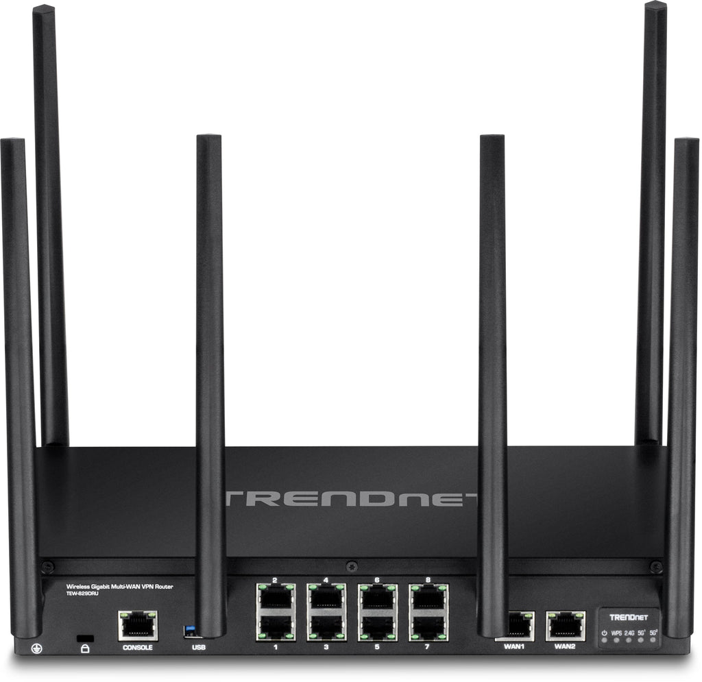 TRENDnet’s AC3000 Tri-Band Wireless Gigabit Dual-WAN VPN SMB Router, model TEW-829DRU, features three concurrent WiFi bands to maximize device networking speeds: two separate high performance 802.11ac networks (5GHz1: 1733Mbps / 5GHz2: 867Mbps), and a 400Mbps Wireless N network. It features dual-WAN ports for load balancing or fail-over modes, and encrypted Virtual Private Network (VPN) access for remote users. Dual-WAN ports smooth network loading, minimize network downtime, and allow employees to access your network from the Internet—all with a single router.