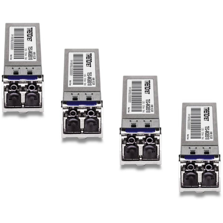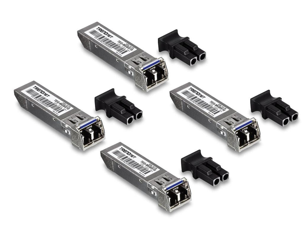 TRENDnet's 4-Pack SFP Single Mode LC Module, model TEG-MGBS10/4, includes four fiber gigabit SFP modules that are compatible with standard SFP slots found on network switches and fiber media converters. Each Single Mode SFP module is equipped with a duplex LC fiber connection interface, and supports gigabit single mode fiber connections for long distance network applications.