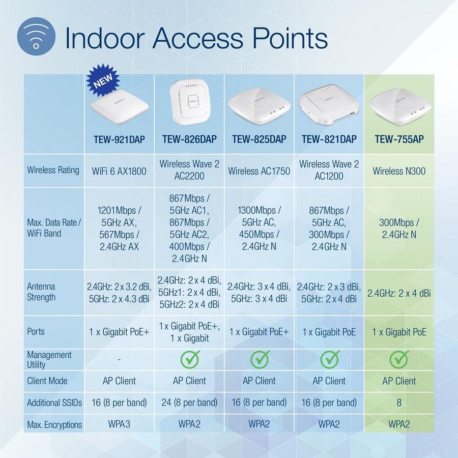 TRENDnet’s high performance N300 PoE Access Point, model TEW-755AP, supports Access Point (AP), Client, Wireless Distribution System (WDS) AP, WDS Bridge, WDS Station, and Repeater modes. It generates a 300 Mbps WiFi N network and features a Gigabit PoE port. The included Windows-based software controller manages multiple TEW-755APs and reduces WiFi management/troubleshooting time. A low profile housing blends into most environments and a mounting plate eases installation.