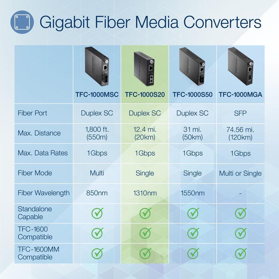 - SC-type single-mode fiber port connects over distances of up to 20km - 1000Base-T Gigabit copper port supports Full-Duplex mode - Supports port level SNMP management - Functions as a stand alone converter or with the TFC-1600 fiber chassis