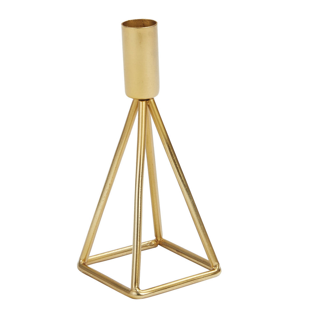 Elevate your home decor with this sleek and modern 7-inch tall Gold Geometric Taper Candle Holder. The minimalist design features an elegant geometric structure, crafted from durable metal and finished with a luxurious gold coating that adds a touch of sophistication to any setting. Perfectly sized to hold a taper candle, this stylish holder instantly brings a warm and inviting glow to your space.