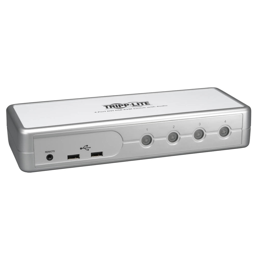 - Control 4 computers with a single DVI monitor, USB keyboard and USB mouse - Switch ports via keyboard hotkeys or pushbuttons - Allows for the sharing of audio components between systems; listen to music from one computer while accessing another - Features two USB 2.0 ports for the sharing of USB peripherals (e.g. flash drives, printers, etc.) between the connected computers - (x4) 6ft USB cables and (x4) 1.83 m (6-ft.) DVI + Audio KVM cable kits included - Full time DDC support provides the necessary EDID information for optimal video performance on Windows 7 and other operating systems - Compatible with all major operating systems" - Fast, easy switching via keyboard hotkeys or pushbuttons - Plug-and-play setup - no software required - Hot-swap capability allows easy addition or removal of computers without powering down the switch or other computers - Speaker and microphone connections allow for the sharing of audio components between systems - Supports 2-Channel Stereo Audio - Independent audio/mic and USB peripheral switching function allows for an uninterrupted experience. A computer can be printing on a printer connected to one of the USB 2.0 peripheral ports, while you listen to audio from and access another computer; all at the same time. - Uses DVI-I technology, allowing for the transmission of a digital (up to 1920 x 1200) or analog (up to 2048 x 1536) signal. A DVI to VGA adapter, such as Tripp Lite's P126-000, is required for conversion to an analog monitor. - To connect to a HDMI monitor, a DVI to HDMI adapter such as Tripp Lite's P132-000 is required (Audio is not supported when converting from DVI to HDMI). - Full time DDC support provides the necessary EDID information for optimal video performance on Windows 7 and other operating systems - Supports Microsoft IntelliMouse and the scrolling wheel on most mice - (x4) 1.83 m (6-ft.) USB cables and (x4) 1.83 m (6-ft.) DVI + Audio KVM cable kits included - Compatible with all major operating systems