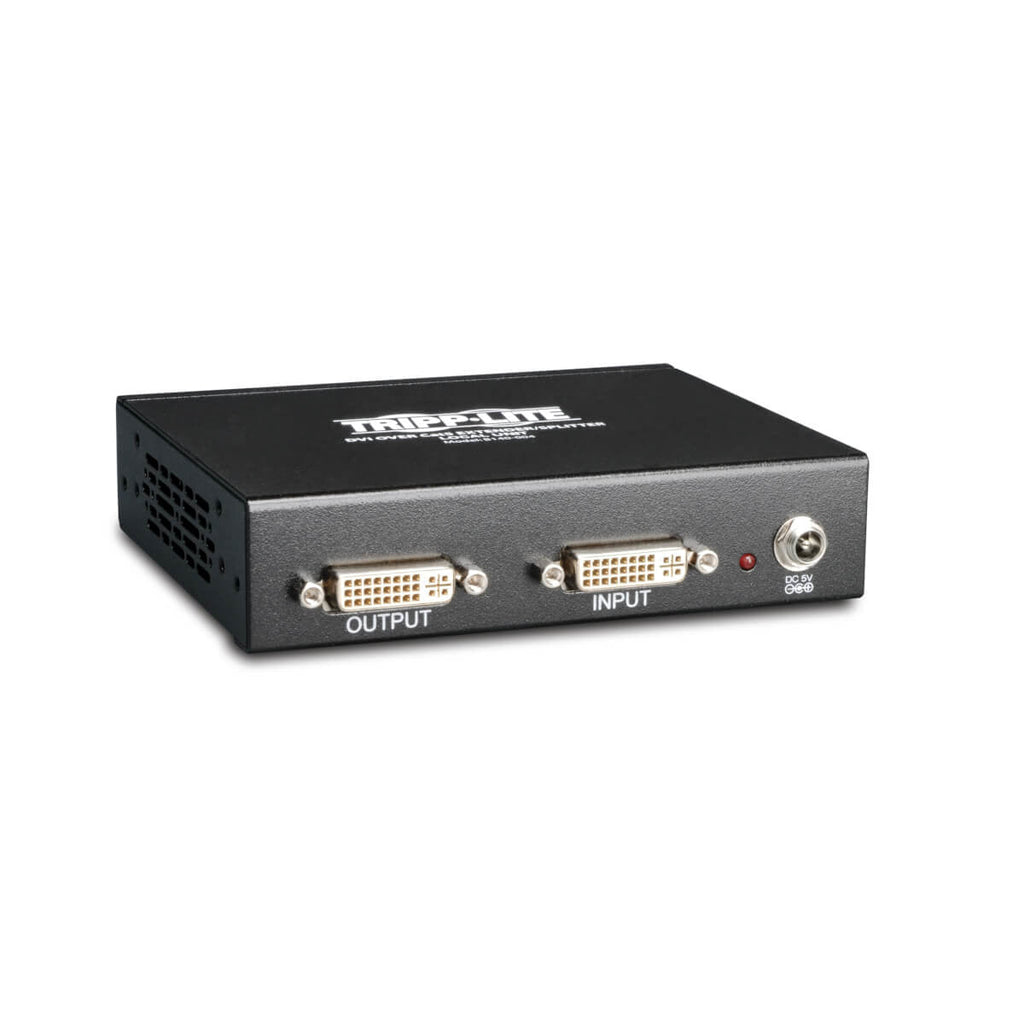 Tripp Lite 4-Port DVI over Cat5/Cat6 Extender Splitter, Video Transmitter, 1920x1080 at 60Hz, Up to 61 m (200-ft.). Video port type: DVI. Maximum resolution: 1920 x 1080 pixels, Product colour: Black, Supported graphics resolutions: 1024 x 768 (XGA). AC input voltage: 100-240 V, AC input frequency: 50 - 60 Hz, Output voltage: 5 V. Package width: 256.5 mm, Package depth: 162.6 mm, Package height: 53.3 mm. Master (outer) case width: 566.4 mm, Master (outer) case length: 274.3 mm, Master (outer) case height: 177.8 mm