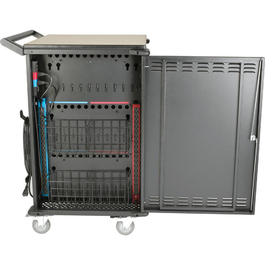 Locking Steel Enclosure Keeps Valuable Equipment Safe and Secure Constructed from heavy-duty steel covered with a black powder-coated finish, this laptop charging cart provides safe, secure storage. Devices and their power adapters are stored in separate compartments. The front and back doors lock with the included keys to help prevent theft, damage and tampering. For extra security, the front door can be fastened with a user-supplied padlock. Flow-through ventilation helps protect against overheating, and the specially coated shelves help prevent device scratches and scuffs.