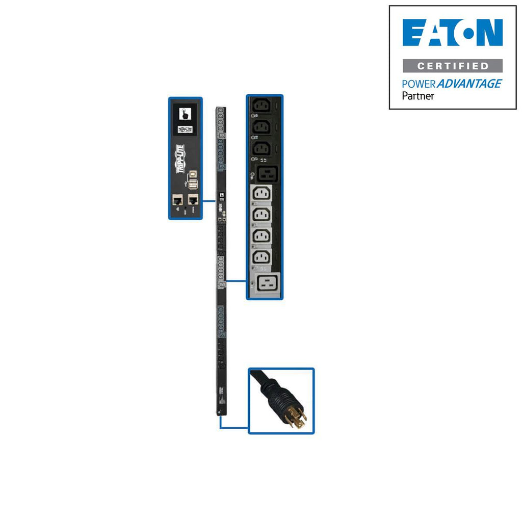 Tripp Lite 6.7kW 3-Phase Switched PDU - LX Platform, 24 C13 & 6 C19 Outlets, L21-20P, 0U, Outlet Monitoring, TAA. PDU types: Switched, Rack capacity: 0U, Type: Three-phase. AC outlets quantity: 30 AC outlet(s), AC outlet types: C13 coupler, C19 coupler, Power plug: NEMA L21-20P. LED indicators: Activity, Network, Status, Cable length: 1.8 m, Security algorithms: SNMP,SNMPv3. Nominal input voltage: 208; 240 V, Maximum current: 16 A, AC input frequency: 50/60 Hz. Width: 55.1 mm, Depth: 72.6 mm, Height: 1778 mm