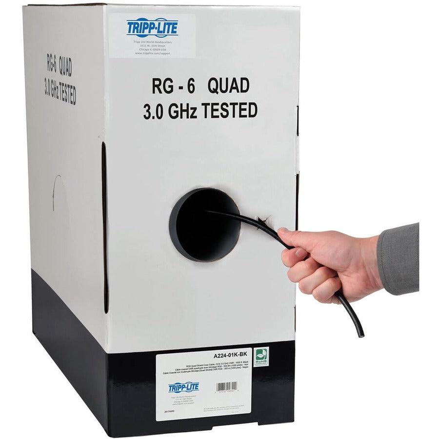 Tripp Lite A224-01K-BK RG6/U Quad-Shield CMR-Rated Coaxial Cable, Black, 1000 ft. (304.8 m). Cable length: 304.8 m, Product colour: Black, Impedance: 75 Ω. Quantity per pack: 1 pc(s), Package width: 530.1 mm, Package depth: 530.1 mm. Products per master (outer) case: 1 pc(s)