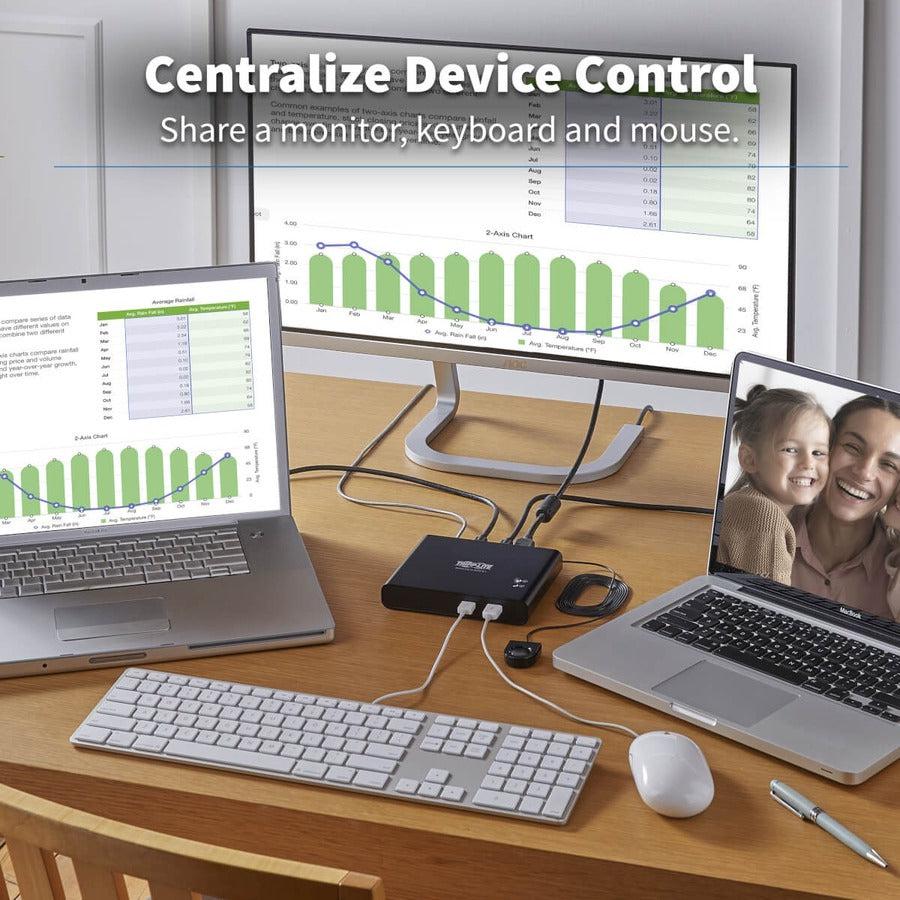 Connects 2 USB-C Sources to a Single HDMI Monitor, Keyboard and Mouse This Desktop KVM/Docking Station lets you access, control, boot and reboot 2 USB-C sources at the same time. Both USB-C sources share one HDMI monitor, USB keyboard and USB mouse, which saves space on your desk or workspace.