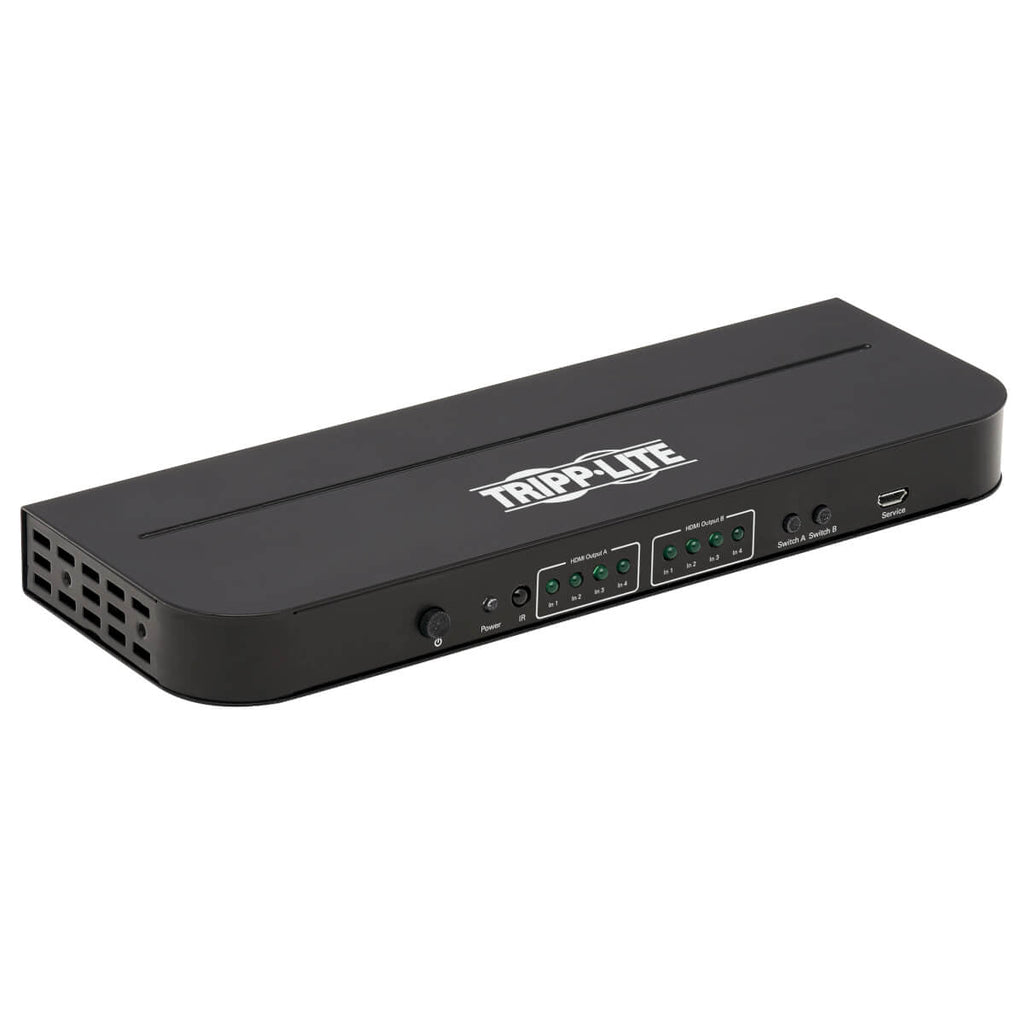 HDMI Matrix Switch for Digital Signage or Other Applications with Multiple Video Displays This matrix switch/splitter features four HDMI inputs and two HDMI outputs. This allows you to connect as many as four high-definition video sources, such as Blu-ray players, video game systems, Roku boxes, laptops, media servers or cable/satellite boxes, and transmit them to two high-definition televisions, projectors or monitors. The B118-2X4-4K-A is recommended for home theaters (transmit to HDTVs located in different rooms) or digital signage applications in classrooms, bars, restaurants, conference rooms, lecture halls and trade shows.