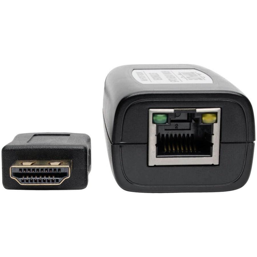 The B126-1P0 can extend a 1080i (60 Hz) signal up to 100-ft. (30.5 m) or a 1080p (60 Hz) signal up to 50-ft. (15.24 m) with a single Cat5e/6 cable (for best results, use 24 AWG solid-wire Cat5e/6 cable, such as Tripp Lite's N202-Series) between it and the transmitter. The built-in HDMI cable features a latching connector that helps prevent accidental disconnection. No external power is required.
