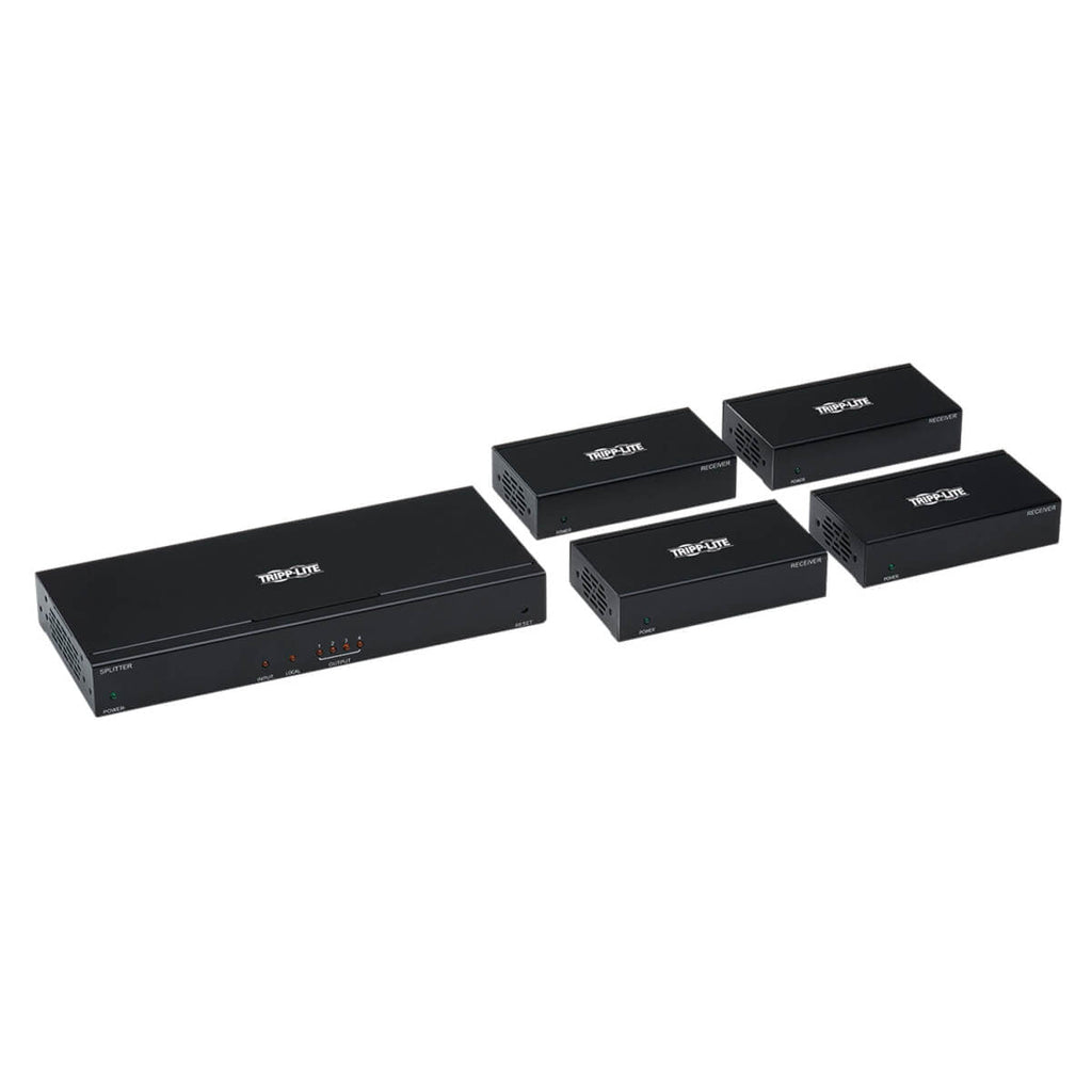 Splitter Kit Ideal for Digital Signage or Displaying Video in Schools or Trade Show Booths The four-port transmitter/splitter and quad receivers are recommended for video presentations in conference rooms, schools, trade shows, meeting facilities, houses of worship, retail settings and other digital signage applications where the source and display are farther apart than conventional A/V cables allow. The B127-004-H4H extends 4K video and stereo audio signals from an HDMI source device to four HDMI displays up to 125 feet (38 meters) away via user-supplied Cat6 cabling.