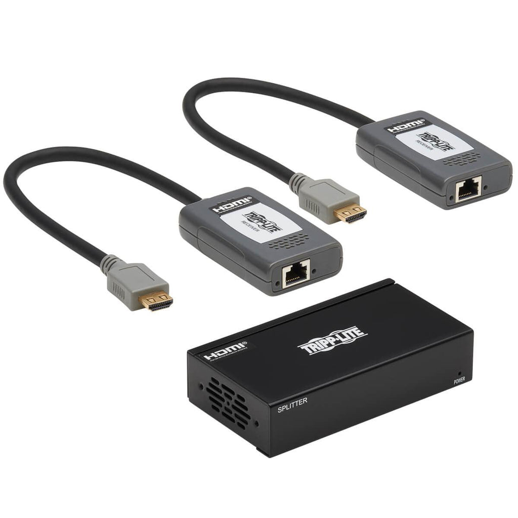 Extends a 4K A/V Transmission up to 230 ft... or Even Farther The included splitter connects to both included pigtail receivers to extend 4K signals from an HDMI source to two HDMI displays up to 230 feet (70.1 meters) away via user-supplied Cat6 cabling. By adding Tripp Lite B127A-010-H signal repeaters (sold separately) to the application, you can extend the signal to each connected display up to 400 feet (121.9 meters).