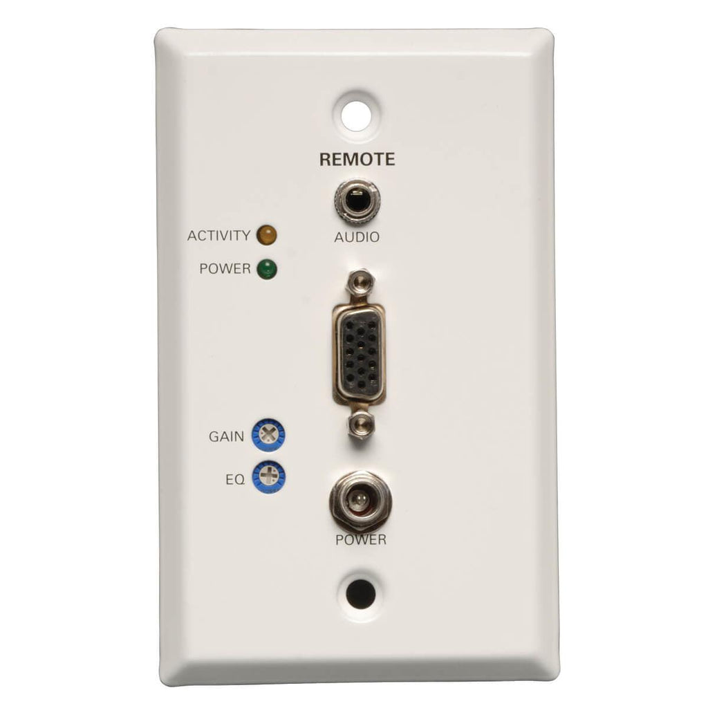 Tripp Lite's B132-100A-WP-1 works with a local transmitter unit to extend a 1920 x 1440 (60Hz) Video and Audio signal up to 152 m (500-ft.), or a 1024 x 768 (60Hz) Video and Audio signal up to 305 m (1,000-ft.) 24Awg, Solid Wire Cat5e/6 cable, such as Tripp Lite's (Cat5) and N222-01K-GY (Cat6), is required to achieve maximum distance and resolution. For optimal image quality between 152 m (500-ft.) and 305 m (1,000-ft.), use Zero-Skew cable, such as Tripp Lite P524-01K. Features built-in Equalization and Gain controls to adjust the video image. RJ45 type wallplate allows you to use standard patch cable, eliminating the need for a 110 punchdown connection. Ideal for digital signage situations, such as retail, schools, churches, etc.